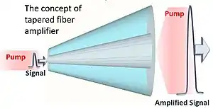 Increasing the diameter of a cylindrical optical fiber amplifiers generally increases the level of non-linear effects such as stimulated Brillouin scattering.[2] The result of forming a tapered geometry double-clad fiber is that the light introduced into the thin end propagates in a wide core without changing the mode content.[3] Consequently, the use of T-DCF for optical amplification in a multi-mode fiber maintains good beam quality by elevating the thresholds of stimulation of non-linear effects including Brillouin and Raman scattering and spontaneous emission. Using tapered fiber with thick end core diameters of up to 200 µm with a 0.11 numerical aperture and record peak power and energy amplification levels 60 ps pulses with 300 µJ energy free of non-linear distortions have been reported.[4]