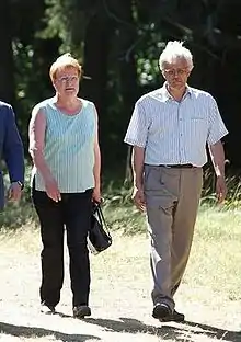 In early 1970 she was elected to represent Central Organisation of Finnish Trade Unions in a committee that called for the recognition of East Germany.[8] Later she became the Vice-President of the committee, which lobbied then-President Urho Kekkonen.[8][9] During the presidential elections of 2006 she was criticized by rivals for this.[10] She responded that the committee was formed by members from many different political parties including conservative parties. In 1973 Finland recognized both East Germany and West Germany as sovereign states.[11]