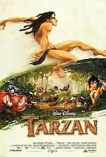 Pre-release tracking indicated that Tarzan was appealing to all four major demographics noticeably for the first time for a Disney animated film since the release of The Lion King.[39] The film's limited release was on June 16, 1999,[1] and the wide release followed on June 18, 1999, in 3,005 screens. During the weekend of June 18–21, Tarzan grossed $34.1 million ranking first on its opening weekend beating out Star Wars: Episode I – The Phantom Menace and notably grossing higher than Mulan and A Bug's Life in their respective box office weekends,[40] and ranked second in Disney animated box office openings behind The Lion King, which earned $40.9 million.[41] By August 1999, the domestic gross was projected to approach $170 million,[42] whereas in the following month, Disney executives expected the film to gross between $450 million to $500 million worldwide.[43] Ultimately, the film closed its box office run with $448.2 million worldwide.[1]