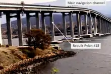 Specialists in marine engineering undertook an extensive investigation to locate bridge debris. This survey took several months to complete, and parts of the bridge weighing up to 500 tons were accurately located using equipment developed by the University of Tasmania and the Public Works Department. Maunsell and Partners were appointed consultants for the rebuilding project. The firm John Holland was awarded the construction contract.[14] Engineers decided not to replace pier 19 as there was too much debris on the site.[15] The Tasman Bridge was re-opened on 8 October 1977, nearly three years after its collapse.[1] The annual expenditures on the Tasman Bridge reconstruction were $1.7 m in 1974–75; $12.3 m in 1975–76; $13.2 m in 1976–77 and $6.1m in 1977–78.[16]