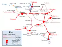 Taunton railway station is a junction station on the route from London to Penzance, 143 miles (230 km) west of London Paddington station.[1] It is situated in Taunton, Somerset, and is operated by Great Western Railway. It is also served by CrossCountry trains and by the West Somerset Railway on special event days and by mainline steam excursions.