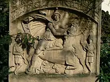 "The model for the Mithraic bull-killing scene was probably the type of winged Nike (Victory) killing the bull, which became a fashionable image once again in the reign of Trajan."[15] The similarity is so great that Cumont mistook CIMRM 25 from near Baris to be related to the Mysteries. This was subsequently corrected by Vermaseren and others[16] as being of Nike. Already in 1899, Cumont had identified the tauroctony as "the imitation of the motif of the classical Greek group of Nike sacrificing a bull",[17] but supposed that both tauroctony scenes were attributable to 2nd century BCE Pergamene artistic traditions.[18][19] This notion has been characterized as one of Cumont's "least happy hypotheses".[20]