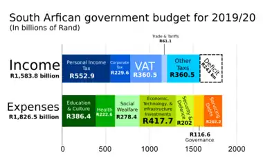 Central government revenues come primarily from income tax, value added tax (VAT) and corporation tax. Local government revenues come primarily from grants from central government funds and municipal rates. In the 2018/19 fiscal year SARS collected R 1 287.7 billion (equivalent to US$ 86.4 billion)[5] in tax revenue, a figure R71.2 billion (or 5.8%) more than that from the previous fiscal year.