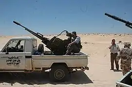 Technicals had also been widely used by the rebels whilst setting up checkpoints. It also formed a vast percentage of the rebel inventory which was limited to light weapons, light body armor and very few tanks. Some medium flatbed trucks carried the Soviet-made ZPU and ZU-23-2 towed anti-aircraft twin or quad barreled guns, as well as recoilless rifles and S-5 rocket helicopter rocket launcher pods.[32] Some rebels have improvised with captured heavy weaponry, like BMP-1 turrets[33] and helicopter rocket pods, as well as lower-tech methods such as using doorbells to ignite rocket-launched ammunition.[34] Rebel technicals have also frequently employed BM-21 Grad rockets. Rocket tubes were salvaged from damaged regime Ural-375D trucks and mounted on the backs of pickups, with the technicals able to fire anywhere from one to six rockets.[35][36][37]
