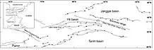 The general strike of the Tian Shan ranges is East-Northeast, but there are significant deviations, especially near the major Talas-Fergana fault.[16] A striking feature of western Tian Shan is the large number of basins containing Cenozoic rocks, prominent basins include the Fergana Basin in the southwest, the Issyk-Kul Basin in the east and Naryn Basin in the south.[16] On the edges of the Tian Shan, there are foreland basins with Cenozoic sediments several kilometers thick. The Talas-Fergana fault is an active strike slip fault in which Quaternary offset is about 10 km and the total offset since the Paleozoic is about 200 km.[16]