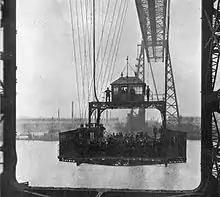 During the First World War Middlesbrough was bombed by an L11 Zeppelin in April 1916.[7] During this raid it was reported that bomb fell through the structure before hitting the river below.[7] During the Second World War the superstructure of the bridge was hit by a bomb. In 1953, the gondola got stuck half-way. While it was stuck, gale force winds lashed water to within inches of it. However, despite this the gondola and the Transporter Bridge are still running in perfect order.