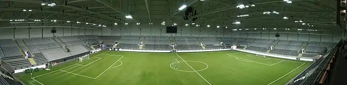 Instead, Stabæk started negotiating with IT Fornebu to take over a lot they owned. They needed a 300 hectares (740 acres) lot which would have a market value of between NOK 60 and 80 million, and Reinsfelt stated that the municipality was willing to help by "maneuver in gray areas within the margins".[12] The club was further pressured by NFF, who were going to limit the exceptions allowed for Nadderud and other stadiums not meeting their criteria.[12] On 29 October, FB and Stabæk signed an agreement whereby Stabæk received a free lot and NOK 50 million, in exchange for FB taking over the commercial properties. The condition was that the municipality allowed a more dense use of the rest of FB's area. This would require a re-regulation of the area, and Reinsfelt estimated that it would not be possible for construction to start until 2006.[13] In November, UEFA changed the rules for artificial turf to state that it had to be green. Until Stabæk's proposal was made, UEFA had not thought that anyone would build a pitch with a non-green turf, and representatives stated that it was because of Stabæk the rule change was made.[14] The plans were nearly terminated in October 2006, after discussion about the planned Fornebu Line—a people mover which would connect Fornebu to Lysaker—stopped the regulation plan.[15] However, in November the final permissions were granted by Bærum Municipality.[16] On 22 December, Stabæk announced that the financing was secured.[17]