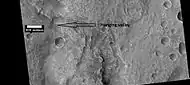 Pits and troughs are common on Mars. Large troughs (long narrow depressions) are called fossae in the geographical language used for Mars. This term is derived from Latin; therefore fossa is singular and fossae are plural.[8] Several mechanisms can form them. Fossae can form when the crust is stretched until it breaks. The stretching can be due to the large weight of a nearby volcano. Fossae/pit craters are common near volcanoes in the Tharsis and Elysium system of volcanoes.[9] Studies have found that on Mars a fault may be as deep as 5 km, that is the break in the rock goes down to 5 km. Moreover, the crack or fault sometimes widens or dilates. This widening causes a void to form with a relatively high volume. When surface material slides into the void, a pit crater or a pit crater chain forms. On Mars, individual pit craters can join to form chains or even to form troughs that are sometimes scalloped.[10]