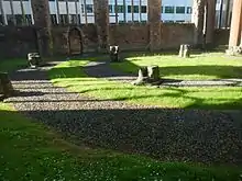 The church was bombed and largely destroyed in the Bristol Blitz. It is a Grade II* listed building,[2] owned by the Diocese of Bristol. In 1958, English Heritage agreed to undertake a guardianship role. A 1960 excavation by the Ministry of Works discovered the plan of the 12th-century church, enabling it to be marked out on the ground in stone.[3]