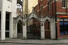 The parish of Temple Fee had come into being by 1308, the first year in which the church was recorded as having a vicar.[3] Temple Fee and Redcliffe Fee were distinct parishes, physically separated by a "Law Ditch".[4] Both were absorbed into Bristol by the city charter of 1373, ending a dispute between Bristol and Somerset over jurisdiction.[5] Temple parish merged into St Mary Redcliffe parish in 1956.[6]