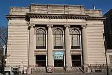 The congregation constructed its own synagogue building at 201 Lenox Avenue, at 120th Street, in 1907.[2][5] The limestone[4] building was not designed in the typical Moorish Revival style of other synagogues of the time; the designer, Arnold Brunner, argued that "synagogues have no traditional lines of architectural expression".[9] According to David W. Dunlap, the building "looks like a Roman temple until you notice the Stars of David in the column capitals, fanlights, and spandrel panels",[9] and "may rank as the single best Neoclassical synagogue in Manhattan".[2] Temple Israel joined the Union of American Hebrew Congregations (now Union for Reform Judaism) in 1909,[5] and a few years later[10] merged with Shaarey Borocho (or Shaaray Beracha), a synagogue of Alsatian Jews.[2][5]