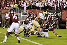Rhule began the 2015 season by beating Penn State, his own alma mater, 27–10 in front of a sellout crowd of 69,176 – a record for a college football game at Lincoln Financial Field.[20] The win against Penn State was the school's first since 1941. The Owls also set an American Athletic Conference record for sacks in a game by recording 10 against highly touted NFL prospect Christian Hackenberg.[21] One of the 10 sacks came on a two-man rush against Penn State's offensive line and was featured on ESPN's "Not Top 10."[22] The Owls followed up their historic win by going on the road and knocking off American Athletic Conference preseason favorite Cincinnati 34–26.