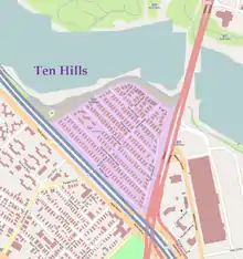 Ten Hills is a neighborhood in the northeastern part of the city of Somerville, Massachusetts. The area is roughly wedge-shaped, about 50 acres (200,000 m2) in size, and is bounded by the Mystic River to the north, McGrath Highway to the east, and is largely separated from the rest of Somerville by Interstate 93 to the southwest.[1] Ten Hills is next to Assembly Square in the east, and Winter Hill in the southwest. The neighborhood landscape is predominated by a single hill (not ten, as the name suggests, although the original farm encompassed 550 more acres of Somerville which had the other 9), the peak of which is roughly at the intersection of Temple and Putnam Roads. The Ten Hills neighborhood is located in Ward 4, Precinct 1 of the City of Somerville, which is in the 34th district of Middlesex County.[2]