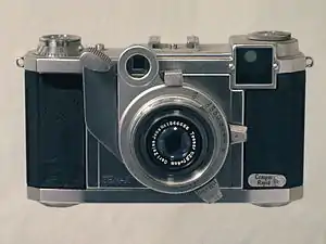 The Tenax II is a 35mm RF-camera launched by ZI in 1938. It produces 50 square exposures on a standard length of 35mm film. It has a Compur Rapid shutter, situated just behind the lens, with speeds from 1 to 1/400 second. The camera is wound and the film advanced simultaneously depressing the large lever on the right-hand side of the lens. At first it was only called the Tenax, but the following year a quite different and less sophisticated camera with the same name was launched, both designed by Hubert Nerwin, supposedly based on Otto Berning's original idea. The 1938 model is known as mark II, or just the Tenax II, while the simpler 1939 model, is known as the Tenax I.[2] The "Tenax" name belonged to the C. P. Goerz company in Berlin, being used from 1907 on folding plate cameras and a Vest-pocket camera from 1909. C. P. Goerz became a part of Zeiss Ikon at its formation in 1926. The name was used again by ZI in the 1960s. The Tenax I was continued for a while in the 1950s in East Germany.[3]