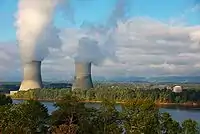 With a generating capacity of approximately 35 gigawatts (GW), TVA has the sixth highest generation capacity of any utility company.[43] TVA's power mix as of 2020 is five coal-fired power plants, 29 hydroelectric dams, three nuclear plants (with seven operating reactors), nine simple-cycle natural gas combustion turbine plants, nine combined cycle gas plants, 1 pumped storage hydroelectric plant, 1 wind energy site, and 15 small solar energy sites.[44] In fiscal year 2018, nuclear generation made up about 40% of TVA's total, coal 26%, natural gas 20%, hydroelectric 10%, and wind and solar 3%.[44] TVA purchases about 15% of the power it sells from other power producers. It purchases power from natural gas combined cycles, coal, and wind, and other renewables.[45] The cost of Purchased Power is part of the "Fuel Cost Adjustment" (FCA) charge that is separate from the TVA Rate. Watts Bar Nuclear Plant produces tritium as a byproduct for the U.S. National Nuclear Security Administration, which requires tritium for nuclear weapons (for "boosted" fission primaries and for fusion secondaries).