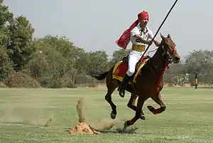 ![]() An officer of the Indian Army tent pegging with the lance | |