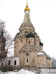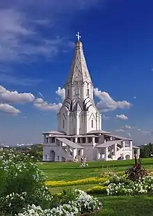 The Ascension church of Kolomenskoye, built in 1532 to commemorate the birth of the first Russian Tsar Ivan IV, often is considered the first tented roof church built in stone. However, Zagraevsky has argued that the earliest use of the stone tented roof was in the Trinity Church in Alexandrov, built in 1510s.[4]