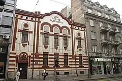 - Hotel Kasina (1935); the old hotel was built around 1860, next to Hotel Pariz. The owner of Kasina was Doka Bogdanović (1860–1914). He allowed for the travelling cinemas to show movies in Kasina in the 1900s and in 1910 Jovanović opened the permanent cinema. In 1913 he founded the "Factory for the making of the cinematography films" and purchased the technology for filming movies. He hired Russian photographer Samson Chernov who filmed photo journals from the Second Balkan War which Jovanović showed in Kasina under the title "First Serbian program". When the World War I broke out, Jovanović and Chernov were filming new movies for the cinema in September 1914 on the Syrmian front, when Jovanović fell off the horse, dying after a while from the aftermaths of the fall.[55] The plays of the National Theatre in Belgrade have been performed here until 1920. The present Hotel Kasina was built at the same place in 1922. Due to the unrepresentative building of the Serbian assembly, and its bad conditions, the deputies occasionally held parliamentary sessions in the "Kasina" instead. This continued after the creation of the Kingdom of the Serbs, Croats and Slovenes in 1918, until the new assembly building was finished in 1936;[56][11]