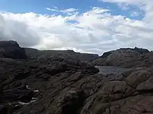 - Guilherme Moniz Volcanic Complex: the southern portion, in the central part of the island, began erupting about 100,000 years later (about 270,000 ka) and produced trachyte domes (approximately 808 m/2651 ft in altitude), flows, and minor pyroclastic deposits for another 100,000 years (until at least 111 ka). The highest point along the caldera rim reaches 623 metres (2,044 feet). The northern portion of the Caldera is less well exposed, but reflects a similar age range. The northwest portion of the caldera was formed sometime after 44 ka. Several well-studied ignimbrites that blanket much of the island likely erupted from Guilherme Moniz Volcano.