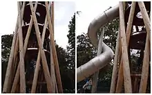 The park is divided into two distinct areas, the 'Homestead' and the 'Paddock'. The 'Homestead', the former site of the farmhouse, offers areas of shade and features the park's signature "10-metre tall treehouse [of four platforms] with a central rope ladder, a [stainless steel] spiral slide, and the log jam".[8] The log jam is a climbable timber structure, and an ‘aerial’ rope walkway.[2]
