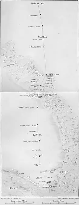 On 13 September 1911, Scott revealed his plans for the South Pole march. Sixteen men would set out, using the two remaining motor sledges, ponies and dogs for the Barrier stage of the journey, which would bring them to the Beardmore Glacier. At this point the dogs would return to base and the ponies would be shot for food. Thereafter, twelve men in three groups would ascend the glacier and begin the crossing of the polar plateau, using man-hauling. Only one of these groups would carry on to the pole; the supporting groups would be sent back at specified latitudes. The composition of the final polar group would be decided by Scott during the journey.[97] For the return journey, Scott ordered that the dogs teams set off again from the base camp to replenish depots and meet the Polar party between latitude 82 and 82.30 on 1 March to assist the party home.[98][99]