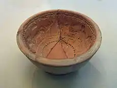 - 'Rouletted' decoration: this is a regular, notched surface texture, created by using a tool with a toothed wheel (roulette) to impress the pattern on the bowl before the clay was hard. It is also possible that it was sometimes made by holding a blade-like tool against the vessel as it turned on the wheel, allowing the tool to judder against the surface of the clay.