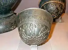 The most recognisable decorated Arretine form is Dragendorff 11, a large, deep goblet on a high pedestal base, closely resembling some silver table vessels of the same period, such as the Warren Cup. The iconography, too, tended to match the subjects and styles seen on silver plate, namely mythological and genre scenes, including erotic subjects, and small decorative details of swags, leafy wreaths and ovolo (egg-and-tongue) borders that may be compared with elements of Augustan architectural ornament. The deep form of the Dr.11 allowed the poinçons (stamps) used making the moulds of human and animal figures to be fairly large, often about 5–6 cm high, and the modelling is frequently very accomplished indeed, attracting the interest of modern art-historians as well as archaeologists. Major workshops, such as those of M.Perennius Tigranus, P. Cornelius and Cn. Ateius, stamped their products, and the names of the factory-owners and of the workers within the factories, which often appear on completed bowls and on plain wares, have been extensively studied, as have the forms of the vessels, and the details of their dating and distribution.[23]
