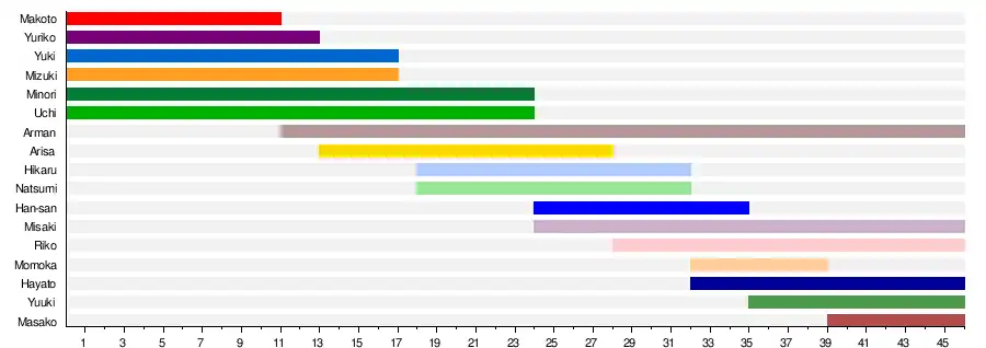 | 15 | Hayato Terashima | 寺島速人 | Hayato-kun | chef apprentice | January 27, 1987 | 29 | 32–46 | 15 |