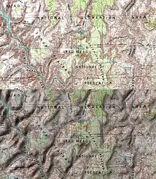 More recently, Tom Patterson developed a computer-generated technique for mapping terrain inspired by Raisz's work, called plan oblique relief.[3] This tool starts with a shaded relief image, then shifts pixels northward proportional to their elevation. The effect is to make mountains "stand up" and "lay over" features to the north, in the same fashion as hill profiles. Some viewers are able to see the effect more easily than others.