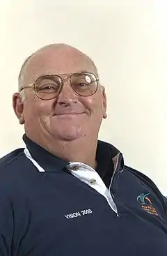 Just before the 2000 Sydney Paralympics, his classification was changed from F56 to F55, and he was told that he had been competing in the wrong disability group for his entire career.[9] He did not win any medals at the 2000 Games.[7] Giddy regretted his disqualification by video footage in the shot put at the Sydney Games after throwing a world record.[6] In 2002, while training in Germany for the world titles in France, he cracked his sternum and hurt his back in a fall. He then prepared for the 2004 Athens Paralympics, but the back injury had flared up again, and the plate in his back had broken in half. He retired in early 2004 due to the injury.[6] He came back for the 2006 Melbourne Commonwealth Games, where he came seventh in the seated shot put, and was Australia's oldest ever Commonwealth Games athlete.[10] At his farewell dinner in 2004, Chris Nunn, Head Coach of the Australian Athletics team at the Sydney Games, said "Whilst you may have travelled thousands of miles in economy class, your contribution has always been first class".[6]