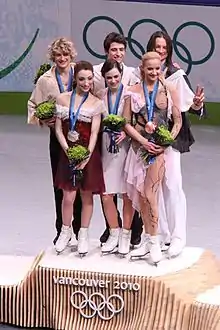 Virtue and Moir competed in the ice dance competition at the 2010 Winter Olympics from February 19 through 22. They placed second in the compulsory dance, earning a new personal best score of 42.74 points, just 1.02 off the lead. They earned 68.41 points in the original dance, placing first in that segment of the competition.[29] They scored 110.42 points in the free dance and won the gold medal overall with an insurmountable total score of 221.57, surpassing silver medallists Davis and White by 5.83 points. In the free dance, they received four 10.00 marks from the judges in the program components, two for the performance execution and two for interpretation,[30] a feat never before accomplished by a figure skater or team under the International Judging System. They became the first Canadian as well as the first North American ice dance team and the youngest dance team to win the Olympics, and the first ice dance team to win the Olympic gold on home ice.[31] They were also the first ice dancers to win gold in their Olympic debut since the inaugural Olympic ice dance event in 1976.[31]