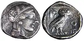 The Athenian tetradrachm was widely used in transactions throughout the ancient Greek world, including in cities politically unfriendly to Athens.[2] Athens had silver mines in state ownership, which provided the bullion. Most well known were the silver mines of Laurium at a close distance from Athens.[4] The Athenian tetradrachm was stamped with the head of Athena on the obverse, and on the reverse the image of the owl of Athena, the iconographic symbol of the Athenian polis, with a sprig of olive and a crescent for the moon. According to Philochorus, it was known as glaux (γλαύξ, little owl)[5] throughout the ancient world[6] and "owl" in present-day English language numismatics.[7] The design was kept essentially unchanged for over two centuries, by which time it had become stylistically archaic. To differentiate their currency from the rival coinage of Aegina using the Aeginetic stater of about 12.3 grams, Athens minted its tetradrachm based on the "Attic" standard of 4.3 grams per drachma. The vast number of "owls-tetradrachms" available those days mainly from the silver mines of Laurium financed the several achievements of Athens, such as the reconstruction of the Acropolis and building the Parthenon, as well as many wars, including the Peloponnesian War.