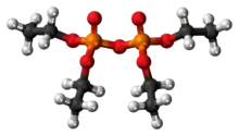 Tetraethyl pyrophosphate, abbreviated TEPP, is an organophosphate compound with the formula [(C2H5O)2P(O)]2O. It is the tetraethyl derivative of pyrophosphate (P2O74-). It is a colorless oil that solidifies near room temperature. It is used as an insecticide. The compound hydrolyzes rapidly.[3]