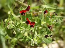 Tetragonolobus purpureus, synonym Lotus tetragonolobus, known as asparagus-pea[2] or winged pea,[3] is an annual leguminous herb native to the countries around the Mediterranean, although introduced elsewhere.[1] It is low growing, and produces a profusion of prominent deep red flowers, followed by seed pods that are longitudinally winged.