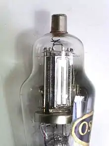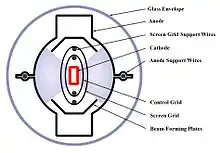 A tetrode is a vacuum tube (called valve in British English) having four active electrodes. The four electrodes in order from the centre are: a thermionic cathode, first and second grids and a plate (called anode in British English). There are several varieties of tetrodes, the most common being the screen-grid tube and the beam tetrode. In screen-grid tubes and beam tetrodes, the first grid is the control grid and the second grid is the screen grid.[1] In other tetrodes one of the grids is a control grid, while the other may have a variety of functions.