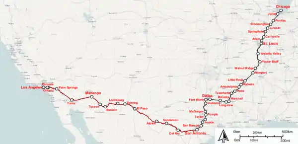 On a thrice-weekly basis, a coach and sleeping car operate from Chicago through San Antonio to Los Angeles (as Train #421/422), in conjunction with the Sunset Limited.[17]