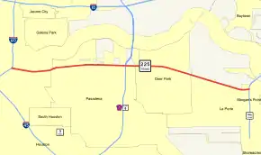 State Highway 225 (SH 225) is an east–west freeway in the Houston area between the Interstate 610 Loop in Houston and State Highway 146/future State Highway 99 in La Porte. It is identified as the La Porte Freeway over its entire length except for Pasadena where it is called the Pasadena Freeway. The freeway passes near several refineries, chemical plants, and tank farms as it passes through Pasadena and Deer Park.
