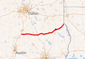 | Chilton | 10.626 155.027 | 17.101 249.492 | interchange; west end of US 77 overlap; route follows US 77's mileage | |||||