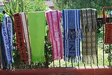 A widely used garment in both indigenous and mixed race communities is the rebozo. This is a long rectangular shawl used both as a wrap and as a means to carry children or heavy objects tied onto the body. The rebozo came about during the colonial period, not in the pre-Hispanic era.[9] The rebozo is a synthesis of three historical influences, the pre-Hispanic "mámatl," the Spanish mantilla and the "repacejo," an Oriental garment.[5] This is a long rectangular piece of cloth with long fringes at both ends. Most rebozos are made with multicolored designs woven into the pieces using threads of different colors. Those of a single color are usually made of yarn or thread that has been tie-dyed to produce color variations in the final piece. This latter style is called "jaspe" or jasper and are usually woven on backstrap looms.[7]