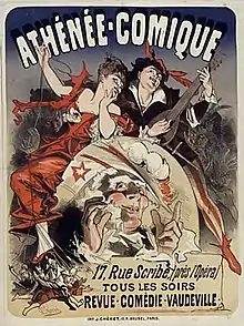 Théâtre de l'Athénée or Salle de l'Athénée was the name of a theatre in the basement of a building built in 1865 by the banker Bischoffsheim at 17 rue Scribe in the 9th arrondissement of Paris (near the new, but at the time unfinished opera house, now known as the Palais Garnier). The Athénée was initially small, with a capacity of 760 spectators, but was enlarged to 900 places by the addition of a top gallery in 1867.[1] The interior was decorated by Charles Cambon. The venue was used by a variety of companies, including the Théâtre des Fantaisies-Parisiennes (1869), the Théâtre Lyrique (1871–1872), the Théâtre Scribe (1874–1875), and the Athénée-Comique (1876–1883). It closed permanently in 1883.[2]