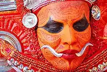 Theyyam or Thirayattam is a ritual performance art form[21] that depict the cultural heritage of North Malabar, especially of ancient Kolathunad. Theyyam depicts Shiva bhutaganas, Kali and other deities and cultural heroes. The drama is enacted based on ancient stories and the language used is "Tottam pattu", a primitive form of Malayalam. Theyyam shows the Buddhist influence from centuries ago. Theyyam is usually held from October to May every year. The colour of Theyyam is typically red. Velan is described in the Sangam literature 500 CE. It could have been a tribal ritual art which evolved under Buddhism and the Brahminic revival of Hinduism. This art form is addressed as "Kaliyattom" North of Pazhayangadi Puzha, Kannur, as "Theyyam" South of the river and as "Tirayattom" around Thalassery.[22]