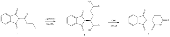 Celgene Corporation originally synthesized thalidomide using a three-step sequence starting with L-glutamic acid treatment, but this has since been reformed by the use of L-glutamine.[27] As shown in the image below, N-carbethoxyphthalimide (1) can react with L-glutamine to yield N-phthaloyl-L-glutamine (2). Cyclization of N-phthaloyl-L-glutamine occurs using carbonyldiimidazole, which then yields thalidomide (3).[27] Celgene Corporation's original method resulted in a 31% yield of S-thalidomide, whereas the two-step synthesis yields 85–93% product that is 99% pure.