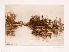 The first wooden bridge over the river at Hampton Court opened in 1753[3] and had a toll collected by a bridge-keeper. A ferry remained at the Swan Inn near the islands until at least 1911, and charged less than the toll.[1][4] The original rather rickety bridge was replaced by a more substantial timber one in 1778. In 1865 this was replaced by a steel and brick bridge, and in 1933 this was in turn replaced by the existing concrete structure. The Thames locks began to appear late in the 18th century, 'Moulsey' (today called Molesey) was built in 1815.[2]