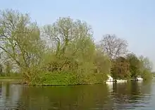 Swan Island is the smallest of the three islands. (51°23′34.5″N 0°19′50″W) On it was once the ferryman's hut, recently rebuilt by the present owner. Local historian Philip J. Burchett surmised that the original incumbent must have passed a meagre life, taking people across the main stream and to and from the island for a small fee at all times of the day and night.[2] After flooding removed part of the upstream end of the main island, Swan Island has become linked to it by a bridge of vegetated sediment at normal flows.