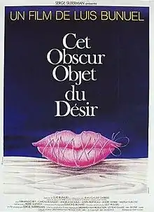 That Obscure Object of Desire (French: Cet obscur objet du désir; Spanish: Ese oscuro objeto del deseo) is a 1977 comedy-drama film directed by Luis Buñuel, based on the 1898 novel The Woman and the Puppet by Pierre Louÿs. It was Buñuel's final directorial effort before his death in July 1983.[1][2] Set in Spain and France against the backdrop of a terrorist insurgency, the film conveys the story told through a series of flashbacks by an aging Frenchman, Mathieu (played by Fernando Rey), who recounts falling in love with a beautiful young Spanish woman, Conchita (played interchangeably by two actresses, Carole Bouquet and Ángela Molina), who repeatedly frustrates his romantic and sexual desires.