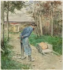 Jean-Baptiste Oudry's classic illustration of La Fontaine's fable, dating originally from the 1730s, showed the peasant lying face upward asleep beneath an oak.[16] It was this interpretation that was later followed in the 18th century Portuguese tiles illustrating the fables that line the cloisters of the Monastery of São Vicente de Fora in Lisbon.[17] In his line engraving for a 1931 English edition of the fables, Stephen Frederick Gooden preferred to show the rustic philosopher pondering the acorn that has just fallen on his head as he lies beside a pumpkin.[18] On the other hand, in his 1881 watercolour, the French Realist painter, Jules Bastien-Lepage, has a blue-clad peasant peering at a large pumpkin in a wheelbarrow.
