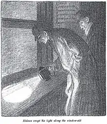 Holmes and Dr. Watson break into Oberstein's empty house and examine the windows, finding that the grime has been smudged, and there is a bloodstain. An Underground train stops right under the window. It would be easy to lift a dead man onto a train roof, as was apparently done. Some messages from the Daily Telegraph agony column, all seeming to allude to a business deal, are also found, posted by "Pierrot", and this gives Holmes an idea. He posts a similarly cryptic message in the Times demanding a meeting, signing it Pierrot, in the hopes that the thief—assuming it is not West—might show up at Oberstein's house.