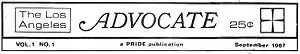 The Advocate was first published as a local newsletter by the activist group Personal Rights in Defense and Education (PRIDE) in Los Angeles. The newsletter was inspired by a police raid on a Los Angeles gay bar, the Black Cat Tavern, on January 1, 1967, and the demonstrations against police brutality in the months following that raid.[4] Richard Mitch (using the pseudonym "Dick Michaels") and Bill Rau (under the name "Bill Rand") joined PRIDE and, along with Aristide Laurent and artist Sam Winston, transformed the newsletter into a newspaper titled The Los Angeles Advocate.[5] The first issue bore a cover date of September 1967, and was sold for 25 cents in gay bars in Los Angeles. By early 1968, PRIDE was struggling to stay viable and Mitch and Rau paid the group one dollar for ownership of the paper in February of that year.[6] In 1969 the newspaper was renamed The Advocate and distributed nationally. By 1974, Mitch and Rau were printing 40,000 copies for each issue.[7]