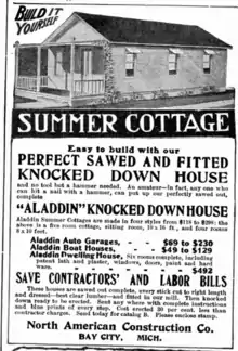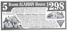 The Aladdin Company was a pioneer in the pre-cut, mail order home industry. Sometimes referred to as Aladdin Readi-Cut Houses, the company was the first to offer a true kit house composed of precut, numbered pieces.[1] Its primary competitors were Montgomery Ward and Sears, Roebuck and Co. in the US and Eaton's in Canada. Two other kit home manufacturers, Lewis and Sterling, were also based in Bay City. Aladdin began operations in 1906 and ceased operations in 1987. In 2014 the rights to the company name and logo were acquired by Charles Munro and sold in 2018 [2]