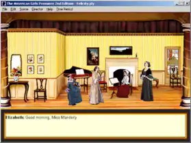 After selecting a character, players are presented with a stage to which plays are created or presented, utilizing a drag-and-drop interface to add actors, props, lighting and other elements to the scene.[2][5] Digitized sprites taken from live actors and props from American Girl's historical collection are used throughout the game, à la-Mortal Kombat. Each of the characters have their own set of outfits based on the historical era their stories take place in, e.g. long gowns and petticoats for Felicity or argyle sweaters and blouses for Molly, along with scenarios from their respective time period. Players can also add dialogue in their productions, either through a voice recording, or using the built-in text-to-speech feature. The game develops skills in storytelling and writing,[7] and is open-ended in nature, allowing the player to create theatrical productions as desired, though the limited selection of characters, props and settings may present creative constraints to some players.[3]